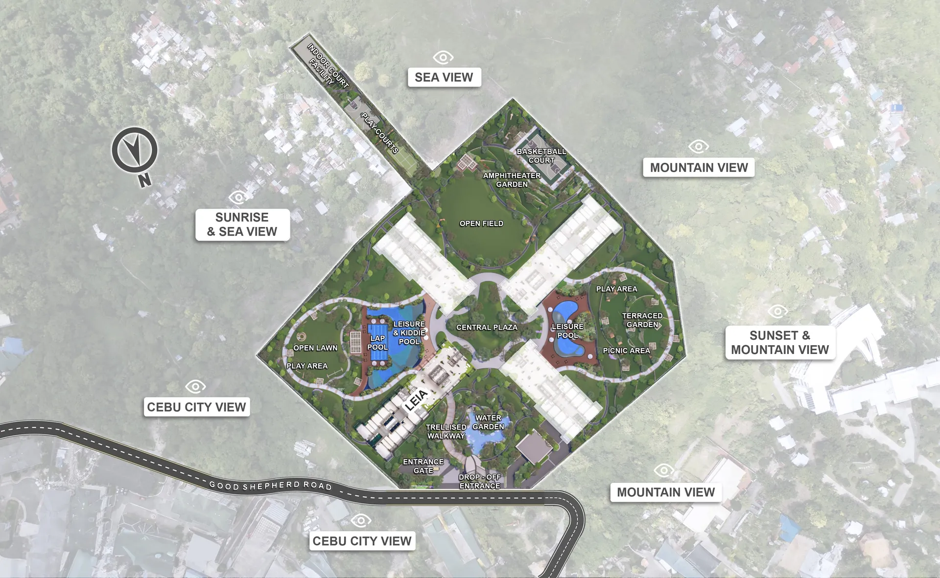 | Outdoor Amenities | Leisure Pool, Kiddie Pool, Lap Pool, Pool Deck & Lounge Areas, Open Lawn, Picnic Areas, Children’s Play Area, Pet Park, Terraced Gardens, Water Gardens, Trellised Walkways, Viewing Decks, Amphitheater, Basketball Court, Multipurpose / Play Courts, Open Field, Walkways & Cycle Paths (approx. 1 km) |